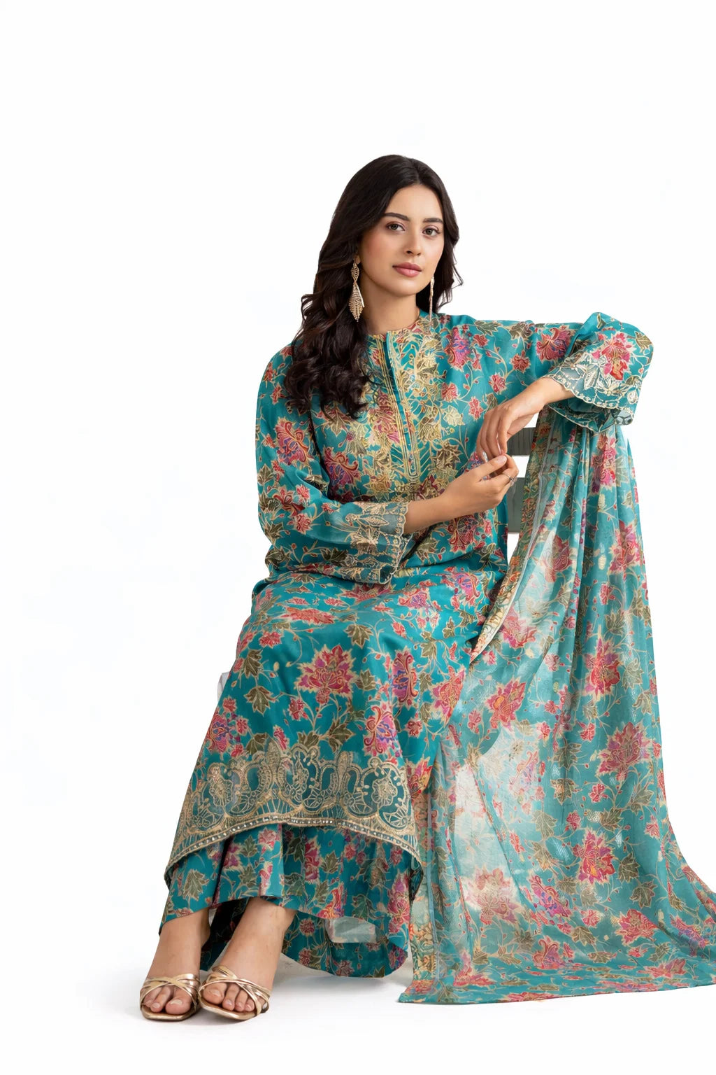 Color: Teal Green Premium Digital Printed Lawn front with beautifully crafted embroidered neckline Digital Printed Lawn back and sleeves for a complete coordinated look Elegant Organza Sequin Embroidered Front Patch enhancing the overall design Matching Organza Sequin Embroidered Sleeve Lace for a refined finish Stunning Digital Printed Jacquard Brosha Dupatta with...